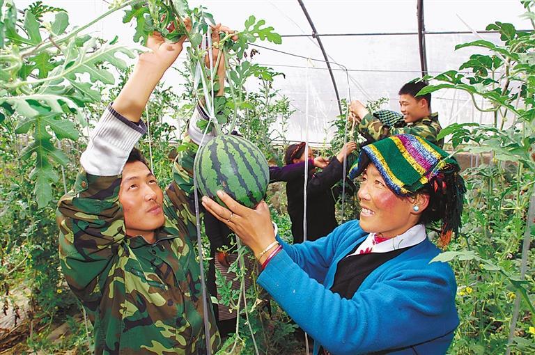 各族群眾廣泛交流、互幫互助、深度交融,共同創(chuàng)造美好幸福生活。圖為西藏自治區(qū)白朗縣彭倉村群眾與山東壽光技術人員共同種植的西瓜喜獲豐收。