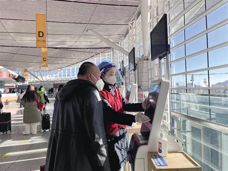 志愿者在自助值機(jī)區(qū)域協(xié)助旅客辦理手續(xù)。圖由民航西藏管理局提供