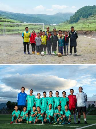 上圖:2019年5月29日,在瓦吾小學(xué)的泥地足球場(chǎng)上,該校足球隊(duì)創(chuàng)建人曲比史古(左一)、來(lái)自長(zhǎng)春的支教老師崔洪明(右一)和足球隊(duì)球員合影。下圖:2020年8月13日,在四川省昭覺(jué)縣拉莫足球場(chǎng),歐足聯(lián)A級(jí)教練哈維爾(后排左一)、搭檔殷建淋(后排右一)與昭覺(jué)皇家馬德里足球隊(duì)球員合影,該球隊(duì)有7名來(lái)自瓦吾小學(xué)的孩子。新華社記者沈伯韓攝