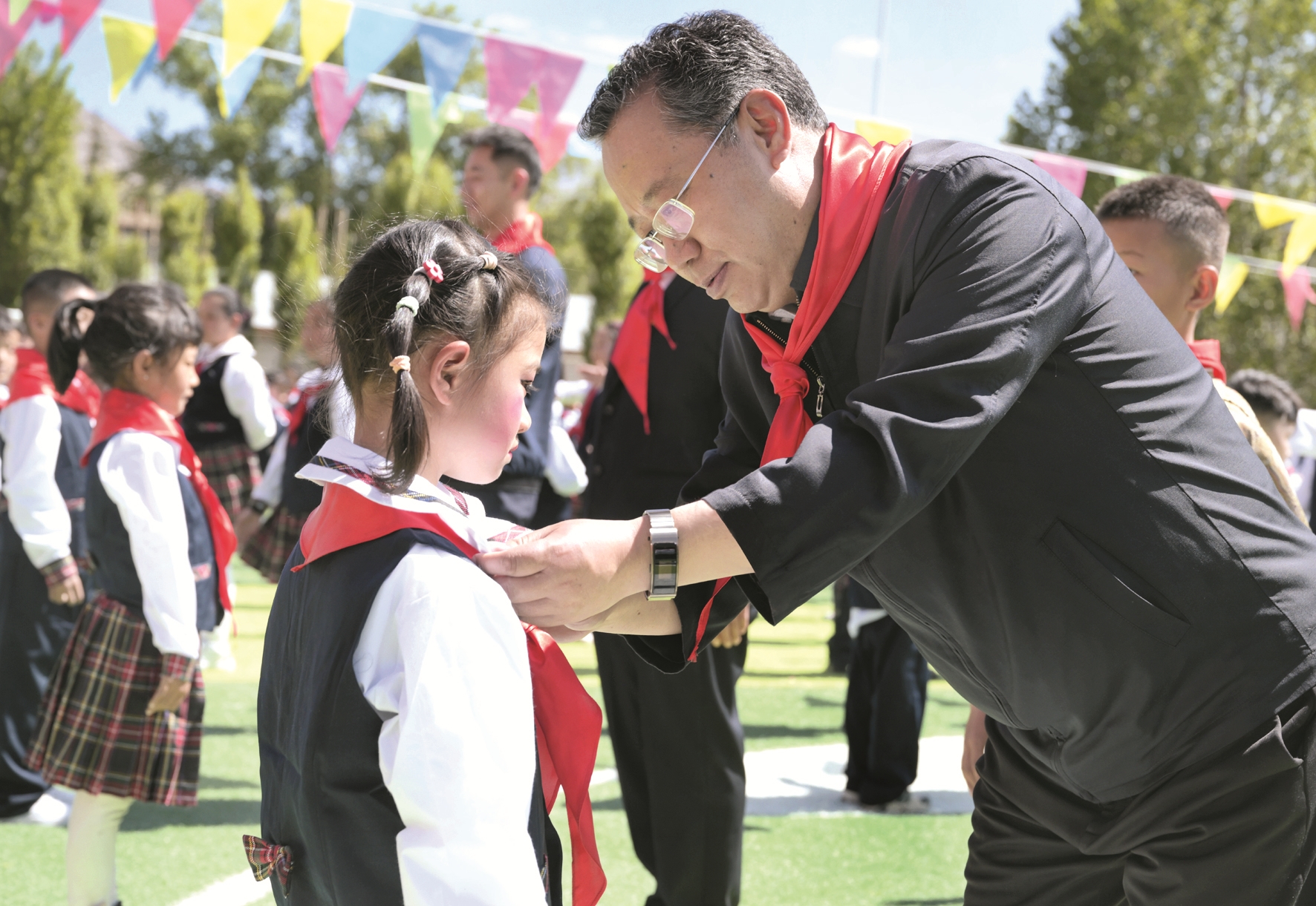 6月1日,西藏自治區(qū)黨委常委、市委書記普布頓珠來到市實驗小學、實驗幼兒園走訪慰問。這是普布頓珠在市實驗小學為少先隊新隊員授紅領巾。拉薩融媒記者 貢覺群培攝