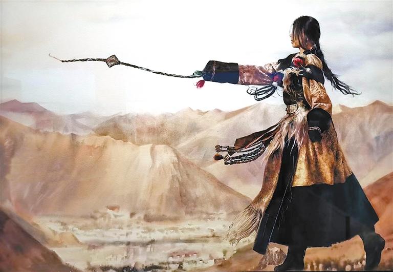 中國畫作品《幸福西藏》運用工筆重彩的繪畫藝術(shù)表現(xiàn)形式,描繪了布達拉宮廣場上民族和睦的美好生活圖景。畫面中,湛藍天空下,藏族群眾與遠道而來的各地游客們相聚雪域高原,燦爛的笑容映照出新時代西藏人民的美好生活,也反映出西藏自然風光、人文風情對各地游客的極大吸引力。從青年旅行者們或騎著單車,或舉起相機認真拍照的表情,能深刻感受到他們對美麗西藏的向往。同時,繪畫作品反映出近年來西藏旅游事業(yè)的蓬勃發(fā)展以及各族兒女團結(jié)互助、攜手進步的新時代美好生活景象。水彩·粉畫《颯·薩》運用人物特寫的藝術(shù)創(chuàng)作手法,展現(xiàn)出一位西藏姑娘甩出烏爾朵的颯爽姿態(tài);油畫《藏歷新年薩迦禳祈福》以明快熱烈的色彩烘托出當?shù)孛癖娺M行藏歷新年祈?;顒拥臍g樂場景;油畫《中國玉麥》以紀實敘事的創(chuàng)作方式,描繪了隆子縣玉麥鄉(xiāng)卓嘎、央宗姐妹放牧守邊的故事,畫面中她們專注地懸掛國旗的樸實舉動,傳遞出高原姊妹對祖國的深愛之情。