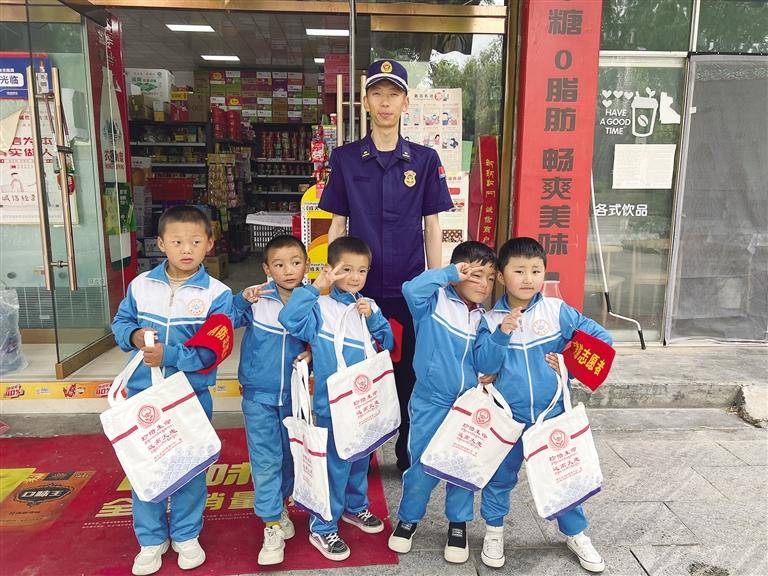 “小小消防志愿者”和消防宣傳員合影。記者 張琳 攝