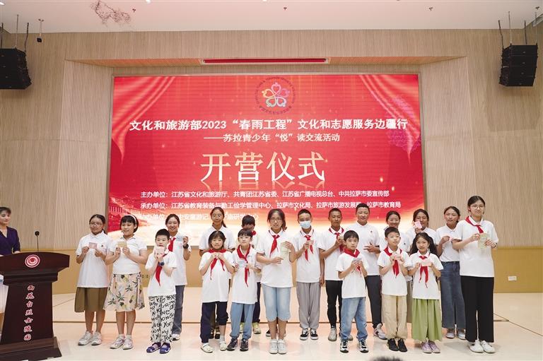 儀式上,江蘇和拉薩兩地青少年圍繞“中華民族一家親,同心共筑中國(guó)夢(mèng)”主題開展了互助結(jié)對(duì)儀式和“春雨工程”授旗儀式,范躍平和陳兵共同將文旅部“春雨工程”項(xiàng)目旗幟授給本次活動(dòng)項(xiàng)目領(lǐng)隊(duì)、拉薩市圖書館館長(zhǎng)朱純琳。