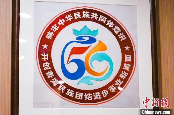 圖為中心內展示的青海省民族團結進步形象標識刺繡作品。馬銘言 攝