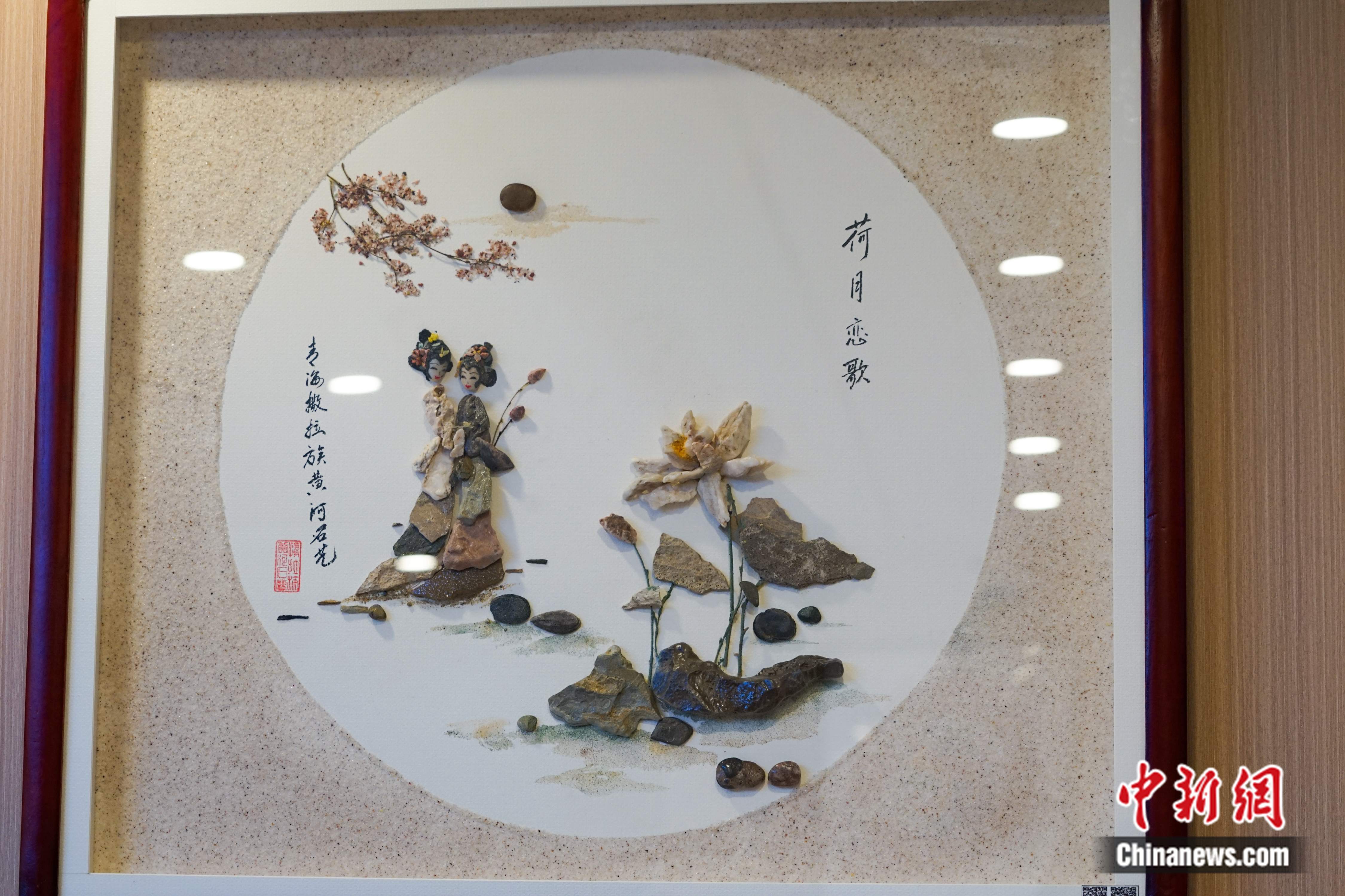 墻上懸掛的青海省民族團結進步形象標識,由多種少數(shù)民族刺繡共同制作而成;撒拉族婦女純手工制作的黃河石藝畫色調古雅、未經雕琢,畫面呈現(xiàn)天然立體感,意境悠遠朦朧。