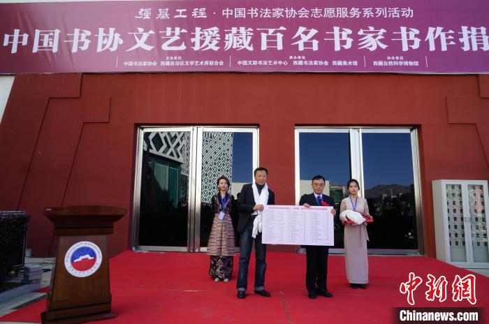 圖為捐贈(zèng)書(shū)法作品交接儀式。普布次仁 攝