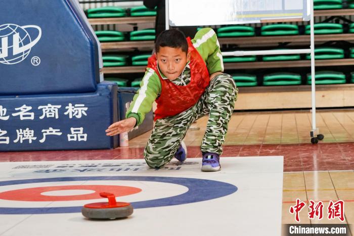 圖為在青海民族大學(xué),一名校園組選手在陸地冰壺比賽中投壺。馬銘言 攝