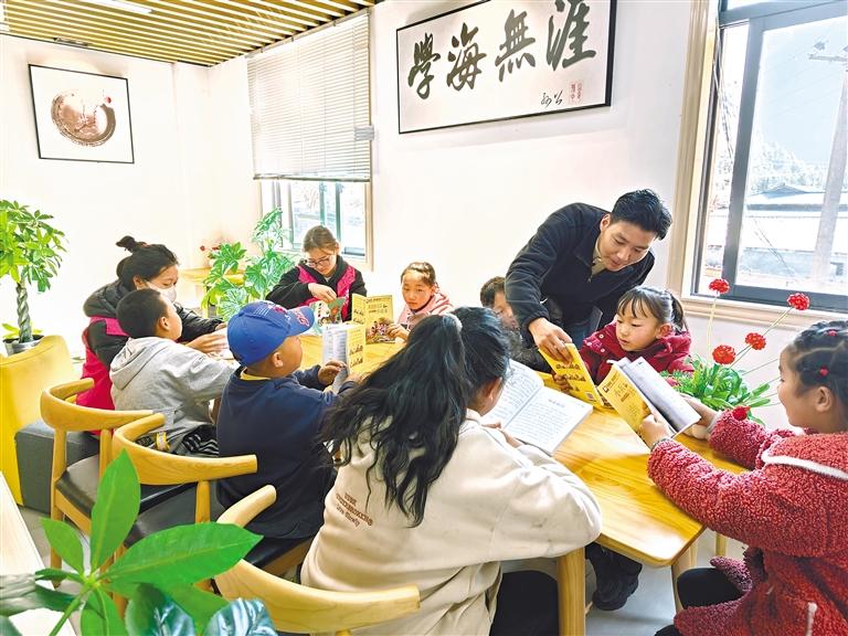 新時代文明實踐志愿服務(wù)隊成員在扎拉村農(nóng)家書屋輔導(dǎo)孩子閱讀書籍。
