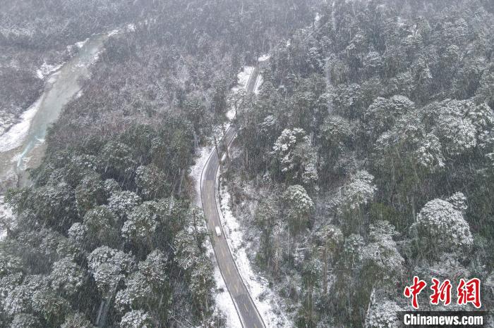 12月18日,西藏墨脫扎墨公路,一輛車(chē)迎著大雪去往墨脫縣城方向。(無(wú)人機(jī)畫(huà)面)中新社記者 江飛波 攝