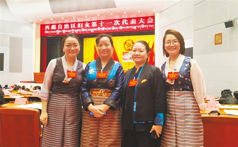 圖為卓瑪(左一)參加西藏自治區(qū)婦女第十一次代表大會時(shí)與其他代表合影。