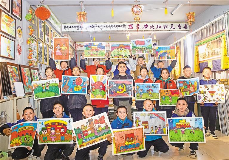 圖為桑日縣中學(xué)美術(shù)興趣社團的孩子們展示以“鑄牢中華民族共同體意識”為主題的繪畫作品。 次仁龍布 記者 洛桑 攝