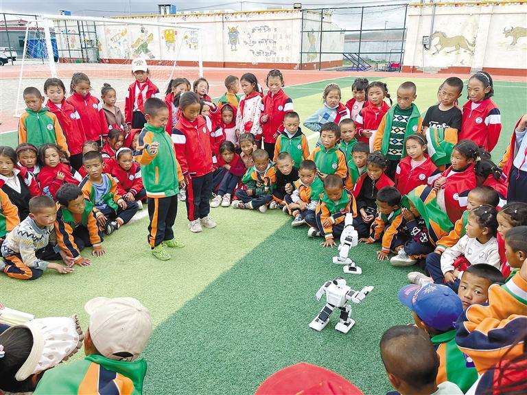 圖為阿里地區(qū)改則縣麻米鄉(xiāng)小學(xué)學(xué)生在觀看機(jī)器人表演。 王飛標(biāo) 記者 潘璐 攝