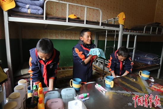 9月14日,西藏那曲市班戈縣第二(中石化)小學(xué),學(xué)生們午休后在宿舍里洗漱。部分離家較遠(yuǎn)的學(xué)生,可以選擇讀書期間全程住校,生活起居都有專門的老師照顧。中青報·中青網(wǎng)記者 孔斯琪 攝