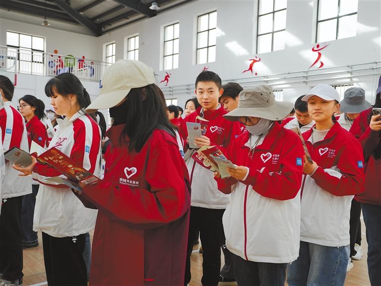 消防指戰(zhàn)員向青年志愿者講解水帶水槍的連接使用。 通訊員 土旦穆朗 攝