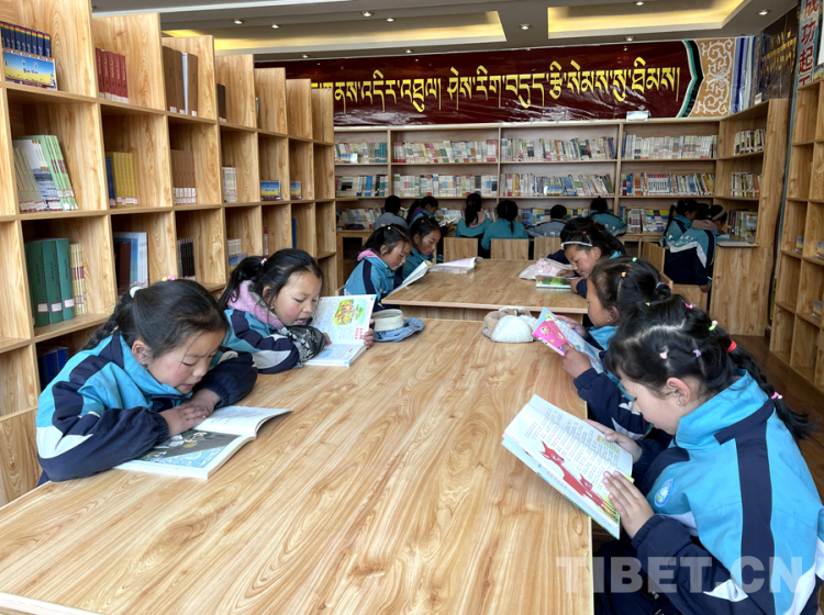 圖為4月23日,在西藏日喀則市薩迦縣雄麥鄉(xiāng)中心小學圖書館內(nèi),小學生們在閱讀書籍 攝影:頓珠次仁