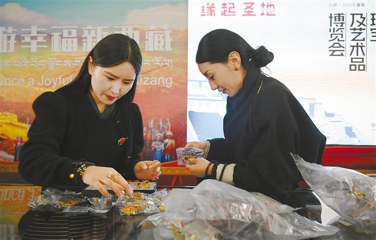 4月24日,2024年春季中國西藏珠寶及藝術(shù)品博覽會(huì)在自治區(qū)會(huì)展中心開幕。博覽會(huì)現(xiàn)場(chǎng)熱鬧非凡,許多市民游客前來參觀、選購商品,共同感受西藏文化的獨(dú)特魅力。 圖為參展商在整理展位上的商品。 記者 王敏 攝