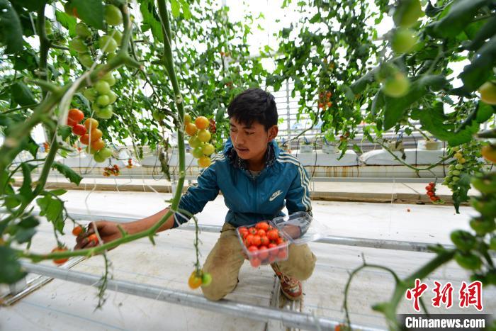 圖為2019年9月,拉薩一高效溫室大棚內,當地年輕的農牧民采摘小番茄準備上市銷售。(資料圖) 江飛波 攝