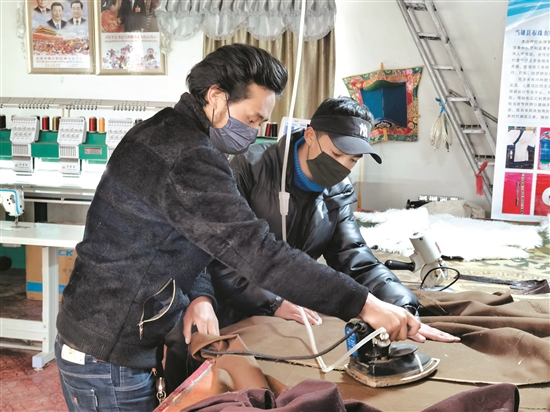 56歲的貢覺是烏瑪塘鄉(xiāng)郭尼村村民,因為腿部殘疾無法干重體力活,家里也沒有其他收入來源,后來布珠手把手教他縫紉技術,他現(xiàn)在是合作社的一名縫紉工?!拔沂?017年來合作社的,現(xiàn)在每月工資有三千元,生活發(fā)生了很大的變化,一天比一天好了,在這里我學會了手工縫紉、機器縫紉等?!必曈X告訴記者,自己不僅僅解決了溫飽,更是學到了一門謀生的好手藝。