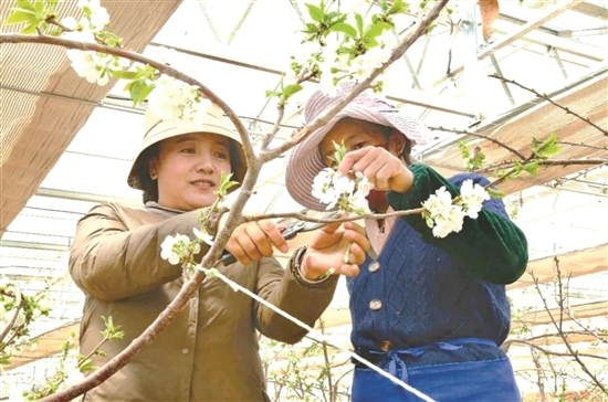 一條條有機基質(zhì)槽均勻分布,一座座日光溫室拔地而起。4月是車厘子樹開花的時節(jié),走進位于烏米組的車厘子種植大棚,就能看到車厘子花競相綻放,一簇簇白色的花朵開滿枝頭,在綠葉和枝干的映襯下,格外賞心悅目。置身于一片花海的當?shù)貏展と藛T正搶抓農(nóng)時,為果樹疏剪花枝、人工授粉,大家各司其職、分工合作,一派熱火朝天的勞動場景。