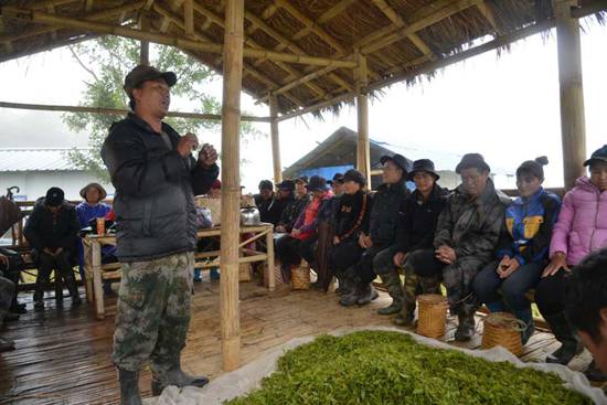 雨越下越大,格桑把村民們叫到茶葉基地旁邊的茅草屋避雨,借此機(jī)會(huì),他又用門(mén)巴語(yǔ)講解了民族團(tuán)結(jié)、掃黑除惡、醫(yī)療報(bào)銷等方面的內(nèi)容,這中間還穿插一些漢語(yǔ)的講解。