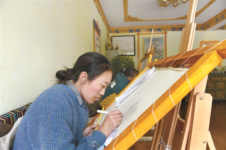 圖為學(xué)生正在認(rèn)真練習(xí)唐卡繪畫。拉薩融媒記者 貢嘎來松攝