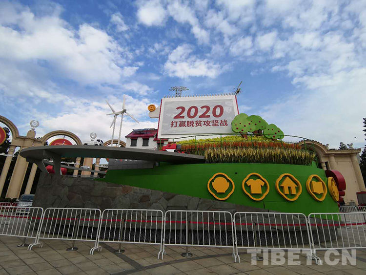 圖為曾在慶祝中華人民共和國(guó)成立70周年大會(huì)群眾游行方陣中亮相的脫貧攻堅(jiān)彩車,側(cè)面的黃色圖標(biāo)所代表的就是兩不愁、三保障 攝影:楊月云