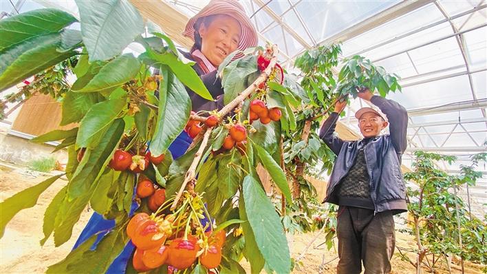 一條條有機基質槽均勻分布,一座座日光溫室拔地而起。走進位于尼木鄉(xiāng)聶玉烏米組的車厘子智能溫室大棚,已是碩果累累,一片片層層疊疊的翠綠中,一個個晶瑩透紅的果子密密匝匝地掛滿枝頭,引得人垂涎欲滴,遠遠看去,猶如一顆顆晶瑩剔透的瑪瑙,煞是喜人——這是雪域高原歷史上結出的首批車厘子。
