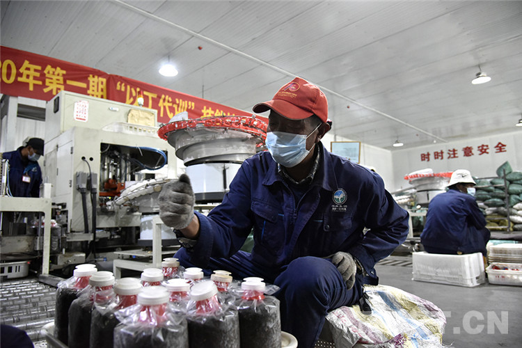 圖為日喀則市珠峰一見則喜生物科技示范園區(qū)裝袋車間里工人正在裝袋 攝影:王媛媛