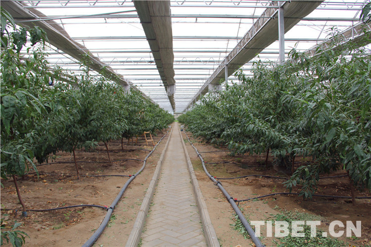 在高原上栽好一棵桃樹需要傾注更多的心血。經(jīng)過大棚的中控室,王榮華說:“這里晝夜溫差大、紫外線強(qiáng),冬天的時(shí)候還要澆凍水、拉膜蓋土、給樹打防凍液,在高原發(fā)展果樹種植困難不少。不同于內(nèi)地的桃樹,在這里快4年了,露天的桃樹只長高兩三米?!闭f到這里,他不由感慨科技種植的力量:“大棚里的桃樹一年就長到3米多高,并且掛果了?;叵?017年時(shí),露天種下的桃樹只有手指粗細(xì),如今長勢這么好,真有點(diǎn)不可思議。”