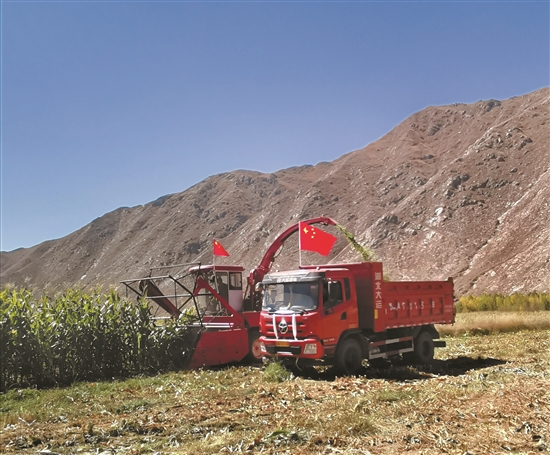 上午11時,收割工作緊張有序進(jìn)行,多臺青貯收割機(jī)開足馬力在田地里奔忙。在齒輪的旋轉(zhuǎn)下,青貯玉米自動收割、粉碎、裝進(jìn)運(yùn)輸車,空氣中混合著濃郁清新的草香味,到處是一派繁忙的收獲景象,這為全區(qū)牦牛越冬儲備下了充足的“口糧”。