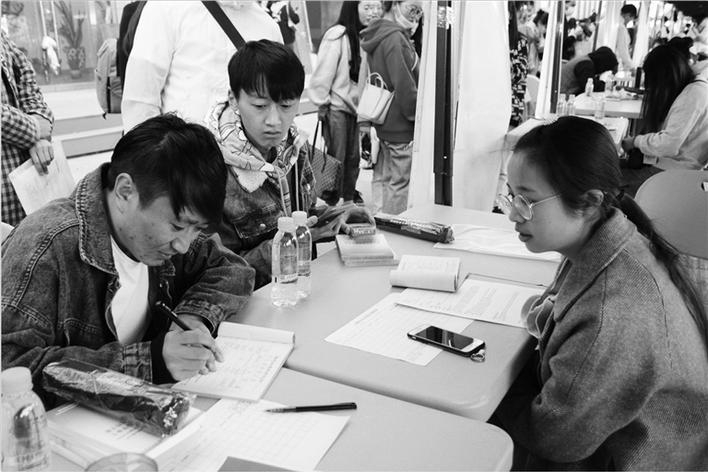 高校畢業(yè)生在招聘會(huì)上填寫求職信息。 文/圖 記者 黃苗 周雨龍