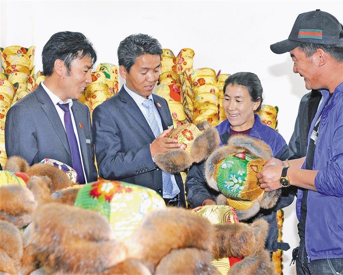 農(nóng)行山南扎囊縣支行客戶經(jīng)理(左二)來(lái)到扎囊縣扎塘鎮(zhèn)羊嘎村藏式帽子次仁金果農(nóng)民專業(yè)合作社對(duì)接產(chǎn)業(yè)扶貧項(xiàng)目。
