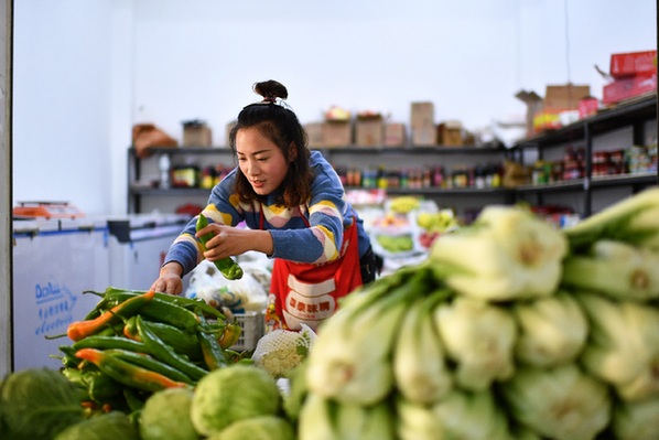 在西藏昌都市丁青縣尺牘鎮(zhèn)農貿市場,商販在整理蔬菜。記者 詹彥 攝