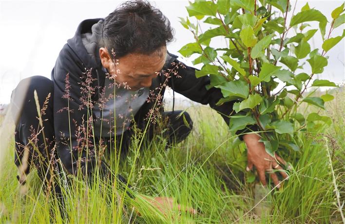 索朗羅布在檢查樹的長勢(shì)(2020年8月8日攝)。新華社記者 覺果 攝