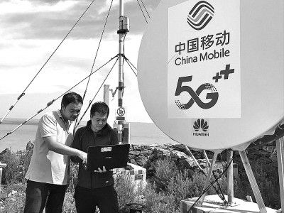 在江蘇灌云縣開山島,中國(guó)移動(dòng)工作人員測(cè)試5G信號(hào)。新華社發(fā)