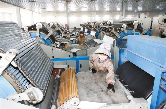 當(dāng)?shù)厝罕娫诶_市達(dá)孜工業(yè)園生產(chǎn)車(chē)間加工羊毛。