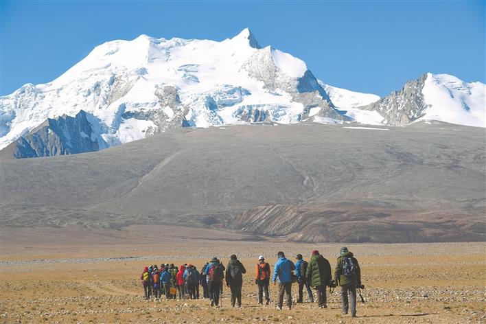 圖為希夏邦馬雪山下,戶外運(yùn)動(dòng)的人們?cè)谙驅(qū)ьI(lǐng)下徒步。記者 李洲 攝