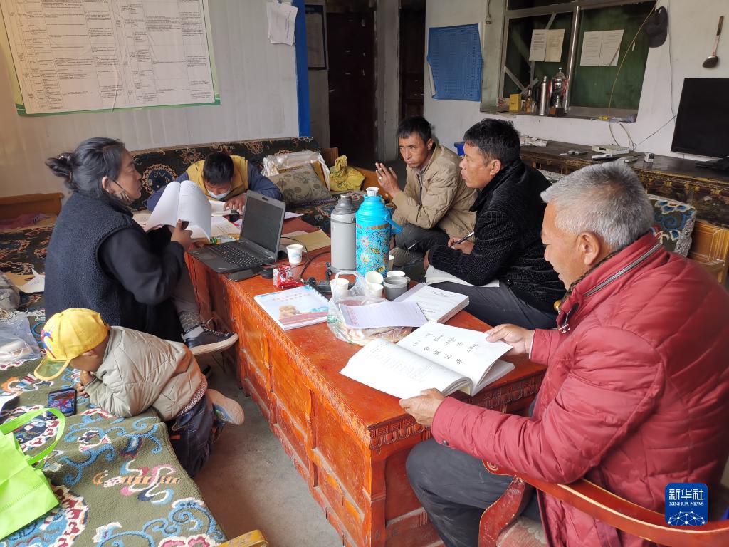 在特布拉村,駐村第一書記吉宗(女,左一)正與其他村干部開會,商討農(nóng)村廁所改造事宜。新華社記者 林建楊 攝(手機照片,4月16日攝)