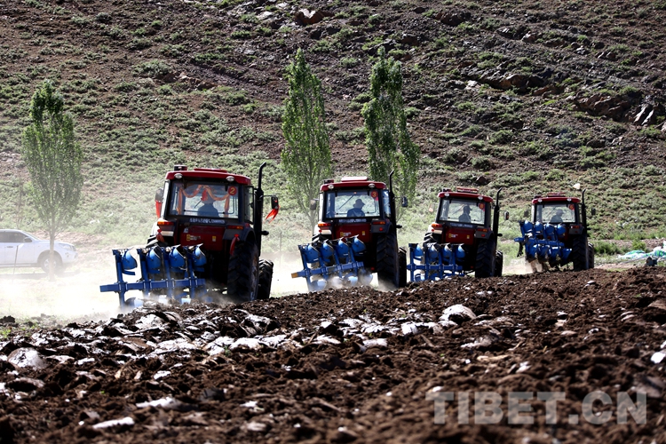 圖為在曲嘎強村四臺農(nóng)用機械聯(lián)合作業(yè)耕種飼草 攝影:王佳豪
