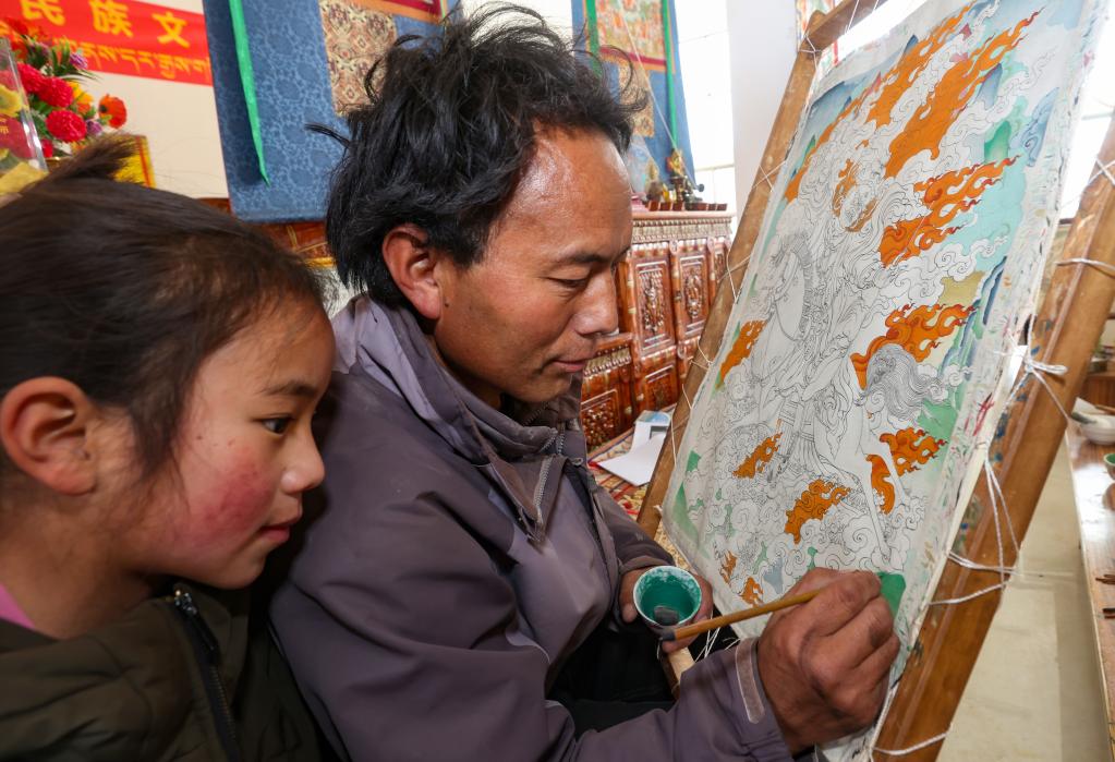嘎桑堅(jiān)參所在的堤無瑪藝術(shù)傳承專業(yè)合作社由桑珠榮亞中村村民、西藏一級唐卡畫師西繞尼瑪創(chuàng)立。據(jù)介紹,目前合作社有25名員工,員工日工資最高超過200元。