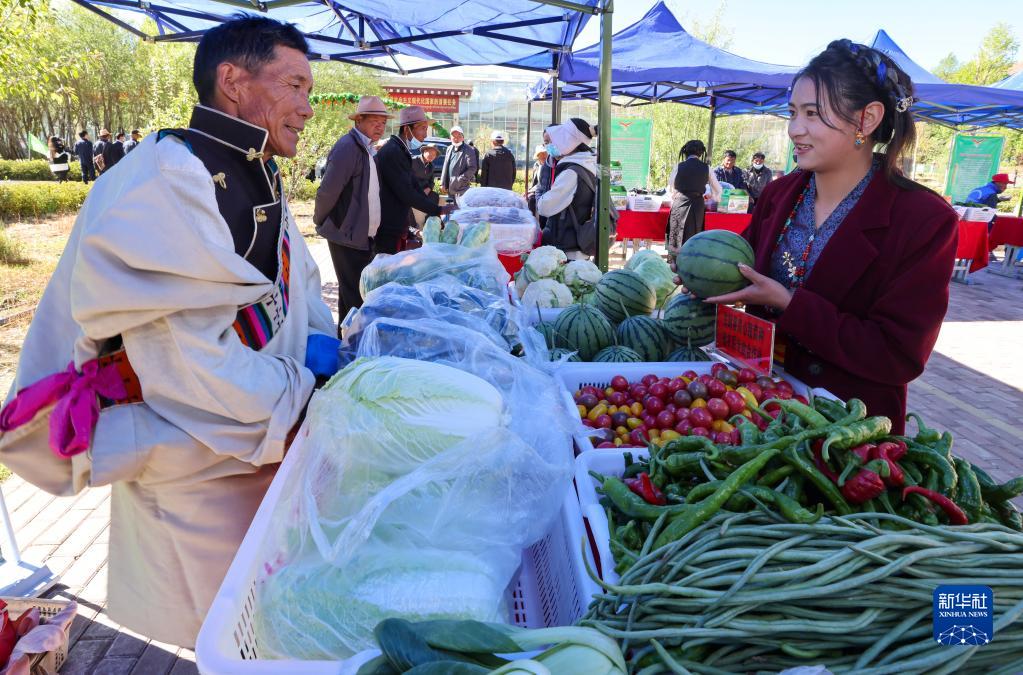 5月28日,珠峰博覽園的工作人員在第十屆白朗果蔬采摘節(jié)上展示自產(chǎn)的蔬菜、水果。新華社記者 姜帆 攝