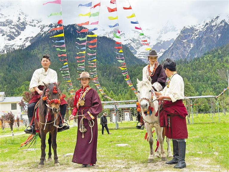 波密縣扎木鎮(zhèn)康木村坐落于318國道旁,風景秀麗,群山環(huán)繞,很多自駕游的游客都會經停于此體驗藏家文化。 圖為游客在康木村,穿著藏裝體驗騎馬樂趣。 圖片由本報記者 張猛 攝