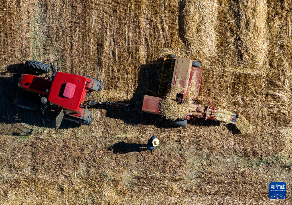 10月24日,村民駕駛農(nóng)機(jī)在拉薩市林周縣強(qiáng)嘎鄉(xiāng)曲嘎強(qiáng)村將收割過(guò)的牧草打包(無(wú)人機(jī)照片)。新華社記者 姜帆 攝