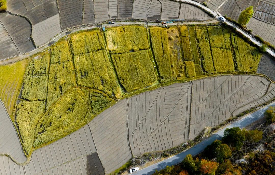 記者來到巴達(dá)村,放眼望去,稻田一片金黃,麥浪中群眾正揮舞著鐮刀,喜笑顏開地收割著親手種植的谷物——一片20畝見方的高原水稻。