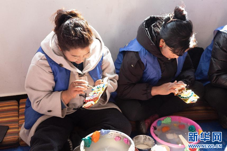 圖為西藏現(xiàn)代服務業(yè)技工學校的學員正在制作卡塞“德格”(1月29日攝)。新華網(wǎng)發(fā) 李騰 攝