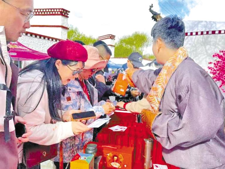 游客在“次仁的家藏式體驗館”區(qū)域拍照打卡集章。