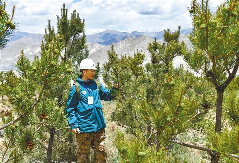 拉薩南北山綠化工程2024年度鞏固提升(貢嘎機場周邊山體)工程項目上,第三方監(jiān)理人員在檢查樹木狀況。新華社記者 晉美多吉 攝