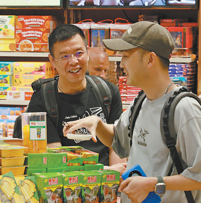 在泰國(guó)曼谷素萬(wàn)那普機(jī)場(chǎng)免稅店,兩名中國(guó)游客正在購(gòu)買當(dāng)?shù)靥厣a(chǎn)品。本報(bào)記者 白元琪攝