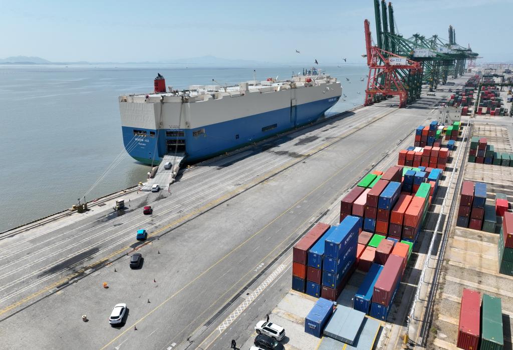 3月12日,準(zhǔn)備出口的車輛從福州港江陰港區(qū)碼頭駛上遠洋滾裝輪(無人機照片)。新華社記者林善傳攝