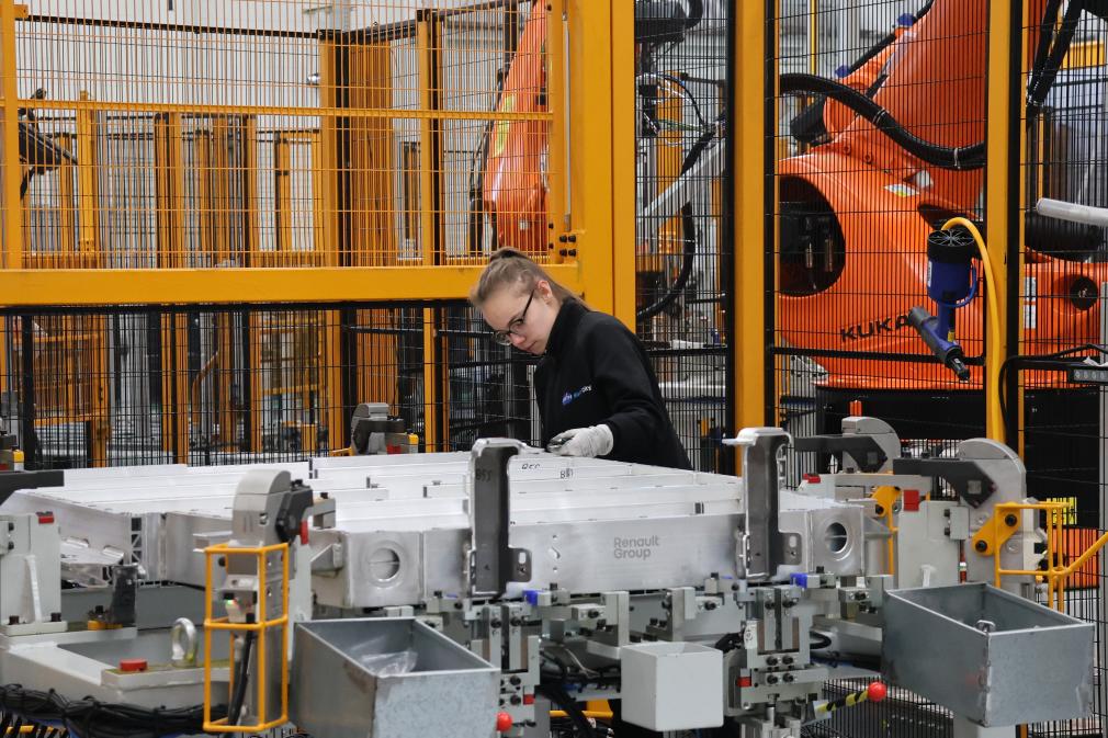 2月23日,在法國呂茨,中國敏實集團與法國雷諾集團成立的合資公司的員工在電池盒產(chǎn)線上工作。新華社記者張百慧攝